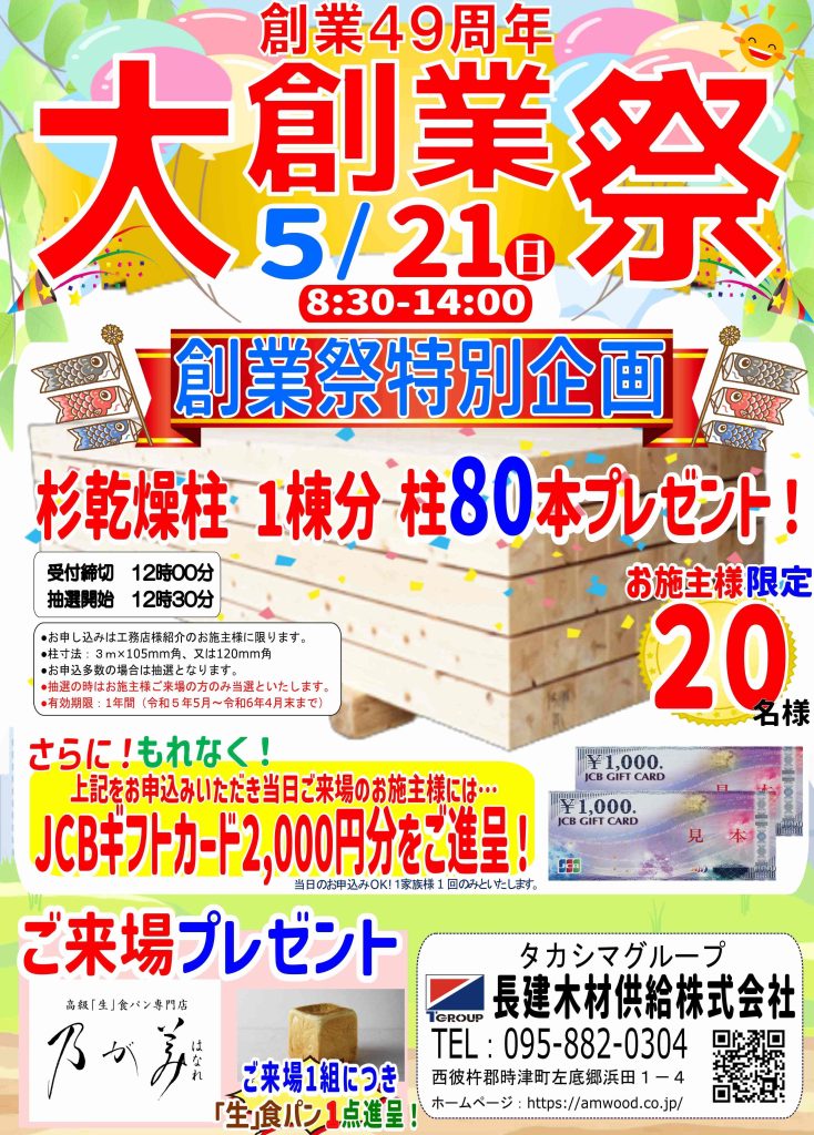 来る5月21日㈰に長建木材供給株式会社にて大創業祭を開催させていただきます。